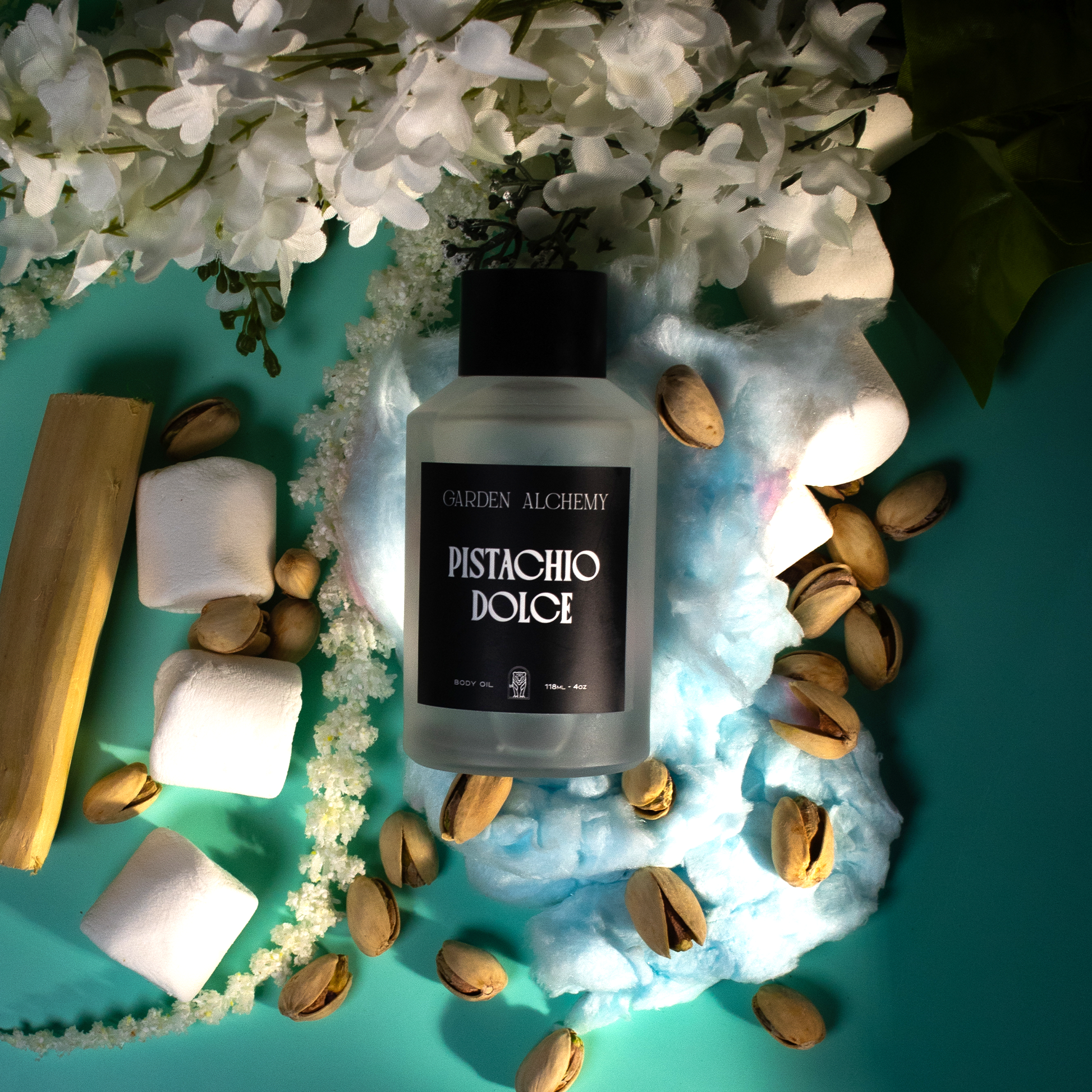 Indulge in decadence with Pistachio Dolce, a luxurious body oil that wraps your skin in a deliciously warm, sweet embrace. It opens with the creamy allure of pistachio gelato, melts into airy cotton candy, and settles into a cloud of rich whipped cream. This gourmand fantasy nourishes your skin while enchanting the senses—like dessert for your body, without the calories.