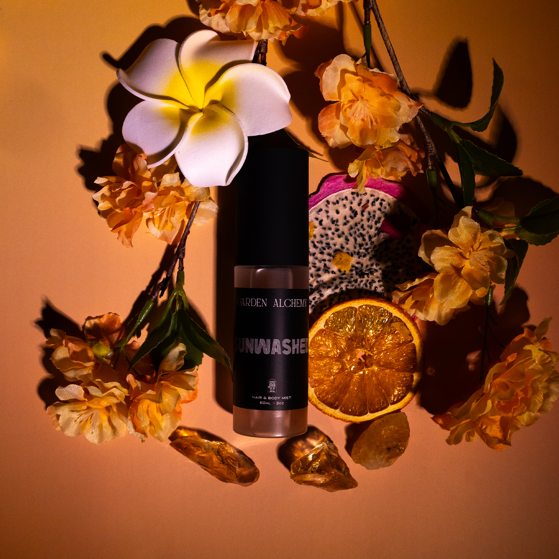 A radiant escape in a bottle. Sunwashed is a tropical hair & body mist that captures the warmth of sun-drenched skin and salty ocean air. It opens with the exotic sweetness of pitahaya (dragon fruit), kissed by sea spray and bright orange oil. Lush tuberose, Moroccan jasmine, and orange blossom bloom in the heart—evoking the heat and beauty of golden hour in a tropical garden. A soft base of amber and musk melts into the skin, leaving a warm, glowing finish.